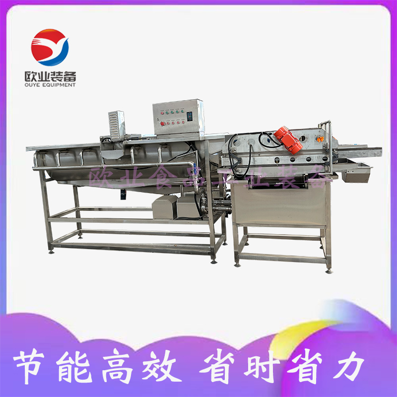 果蔬渦流氣泡清洗機除電機、軸承等標準件外均采用不銹鋼SUS304材料制作,符合出口食品衛生要求。設備中設有氣泡發生裝置,使物料呈翻滾狀態,去除產品表面農殘的功效,同時可加入適量的藥劑,進行消毒固色。漂浮物可以從溢流槽溢出,沉淀物從排污口排出,以達到清洗的目的。該設備在氣泡、沖浪、提升、噴淋等聯合工作下,具有洗潔凈高、節能、節水、設備穩定可靠能保持原有色澤等特點。